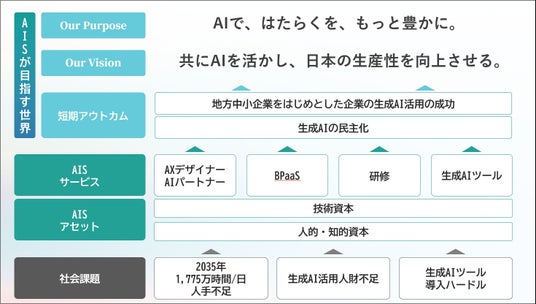 『2035年に1,775万時間/日(※1)不足する』と試算される深刻な人手不足、そして『生成AI活用人財の不足』という社会課題を解決するため、AISは生成AIを現場で使える力に変える専門会社として独自のサービスを提供します。
