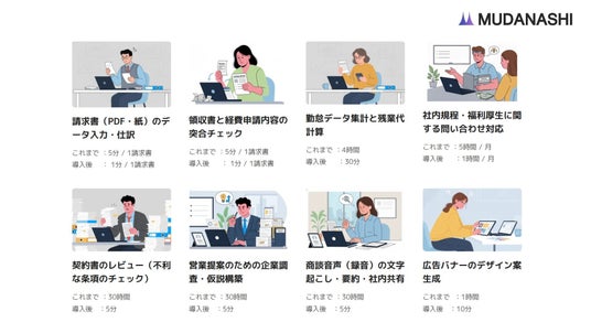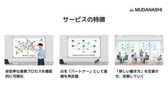 「ムダナシ」は、業務コンサルティングを通じて企業の潜在的な「ムダ」を発見し、AIとの協働を前提とした「業務の再設計」までをスピーディーに支援するサービスです。