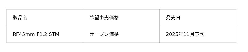 キヤノンは「EOS Rシステム」の交換レンズ「RFレンズ」の新製品として、大口径レンズならではのボケ味を生かした撮影を気軽に楽しみたいユーザー向けの標準単焦点レンズ“RF45mm F1.2 STM”を2025年11月下旬に発売します。