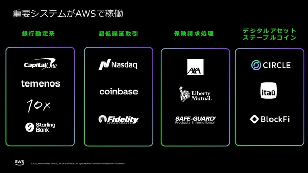 例えば、キャピタル・ワン(Capital One)やテメノス(Temenos)、10x Banking、スターリングバンク(Starling Bank)などが、勘定系システムをAWS上で稼働。さらに、サークル(CIRCLE)やイタウ・ウニバンコ(Itau Unibanco)、ブロックファイ(BlockFi)といった仮想通貨の領域にも、AWSの導入が進んでいるという。