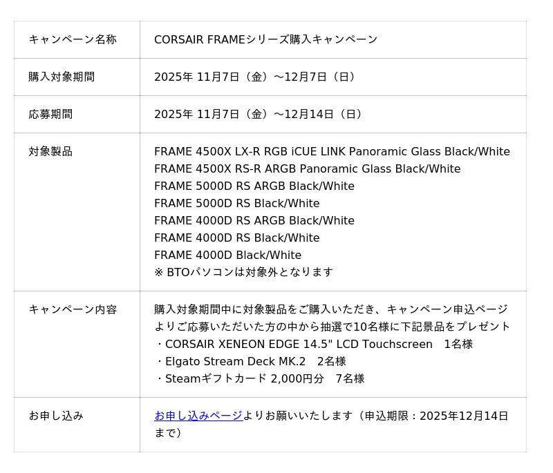 株式会社アスク(本社:東京都千代田区)は、2025年11月7日(金)~12月7日(日)の期間、CORSAIR社製ミドルタワー型PCケース「FRAME」シリーズをご購入いただいた方を対象に、抽選で豪華景品が当たるキャンペーンを実施いたします。