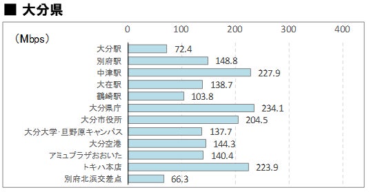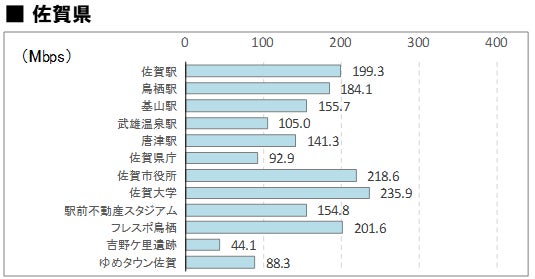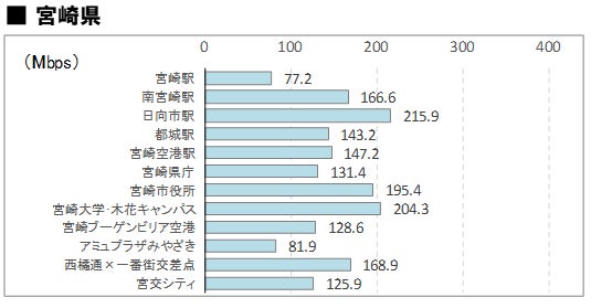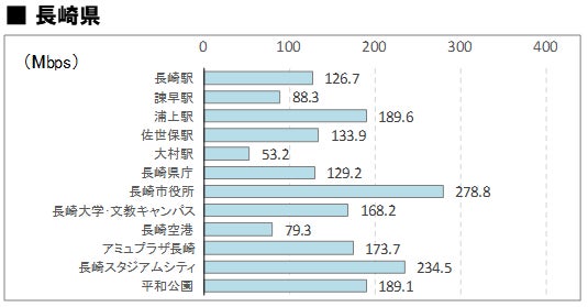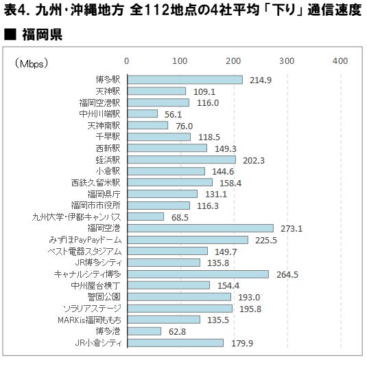 測定地点ごとに見ると、今回調査における下り通信速度の最速地点は熊本県のサクラマチクマモト。4社平均下り速度は325.9Mbpsであり、今回調査において唯一、4社平均下り速度が300Mbpsを超えた。熊本県庁(289.5Mbps)、長崎市役所(278.8Mbps)が続いた。一方で、4社平均の下り速度が最も遅かったのは、佐賀県の吉野ケ里遺跡(44.1Mbps)。光の森駅(51.4Mbps)、大村駅(53.2Mbps)がこれに続いた。4社平均下り通信速度が50Mbpsを下回ったのは、112地点中1地点であり、他の地方と比べて50Mbps未満の地点数は少ない。