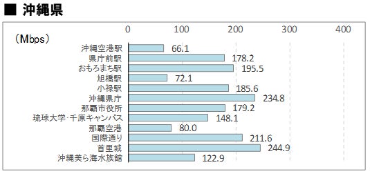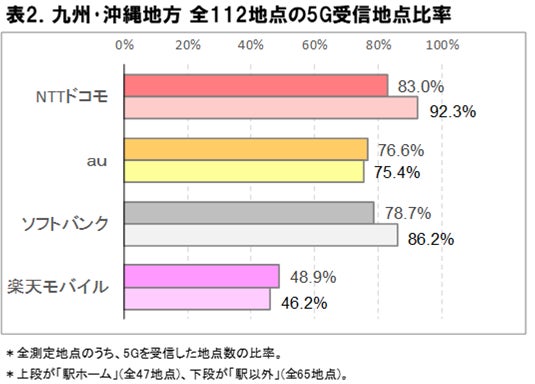 調査の結果、九州・沖縄地方 全112地点の下り通信速度は、NTTドコモが198.7Mbpsでトップ。ソフトバンク 193.4Mbps、au 171.0Mbps、楽天モバイル 55.4Mbpsと続いた。4社平均の下り通信速度の平均は、154.6Mbpsである。北海道・東北地方、中国・四国地方、中部地方ではいずれもソフトバンクが下り速度がトップであったが、九州・沖縄地方ではNTTドコモがトップであった。4社平均の下り通信速度については大きな差ではないものの、他のいずれの地方よりも速い結果となっている。