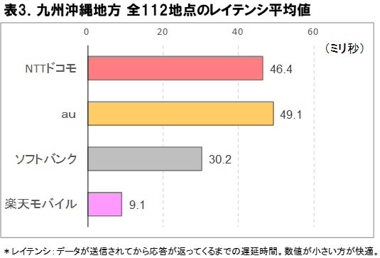レイテンシ(遅延時間)は値が小さい方が快適だとされるが、全112地点のレイテンシ(遅延時間)は楽天モバイルが9.1ミリ秒で最短であった。ソフトバンク(30.2ミリ秒)、NTTドコモ(46.4ミリ秒)、au(49.1ミリ秒)と続いた。他の地方と同様に、楽天モバイルの遅延時間の短さが目立つ。