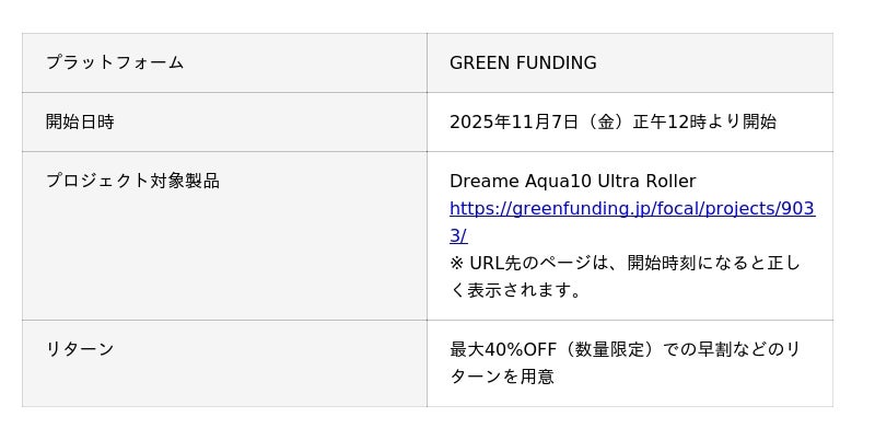 フォーカルポイント株式会社(本社:東京都港区、代表取締役 恩田英樹 以下フォーカルポイント)は、スマート家電ブランドDreame Technologyの国内代理店として、最新のフラグシップモデルであるロボット掃除機「Aqua10 Ultra Roller」のクラウドファンディングを2025年11月7日(金)正午12時よりGREEN FUNDINGにて開始します。
