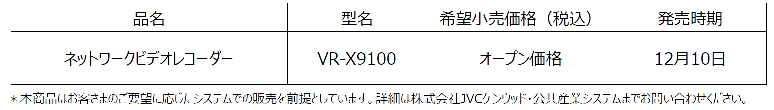 JVCケンウッドグループの株式会社JVCケンウッド・公共産業システムは、Victorブランドより、業務用ネットワークビデオレコーダーの新モデルとして、「VR-X9100」を、12月10日より発売します。