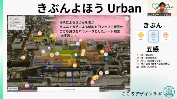 京都市の京都駅前広場の再開発における課題や、都市の移動における「効率優先」からの脱却、特にHSP(Highly Sensitive Person)のような感覚過敏な人々の疲弊に着目したアプリケーションを制作。光、音、匂い、混雑度、温度といった五感に関する「感情」を地図上に投稿・共有することで、利用者の特性に合わせた「心地よさ」を基準としたルート検索を可能にするプラットフォームを目指したとのこと。