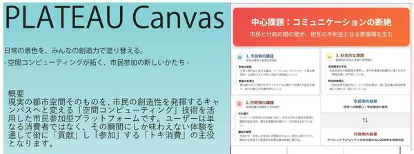 PLATEAUの3D都市モデルを基盤として活用し、ベンチなどの設備やカフェなどの施設、アート作品など市民が「この場に設置したい」と思うものをAIで生成し、ARで現実の街に重ねて示すことでリッチな体験を創出。また、街の人流や交通量のデータ、自治体の政策などの情報をAIを使って3D都市モデル上で可視化するという。