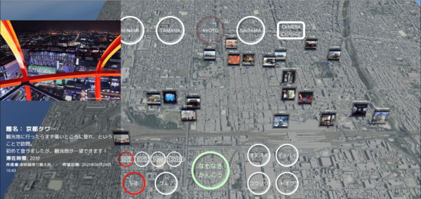 京都市に多数存在する撮影場所や撮影時期が不明な古い写真を有効活用するためのダッシュボードアプリを発表。ユーザーがチャットを通じて協力し、写真の撮影場所や時期を特定する「ノンフィクションの謎解き」体験を提供する。