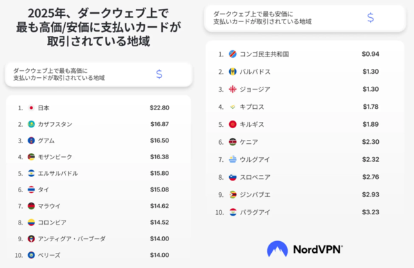 [セキュリティ] ダークウェブで売買される盗難クレジットカード情報、日本発行のカード情報は“世界一高額”(NordVPN、11月6日)