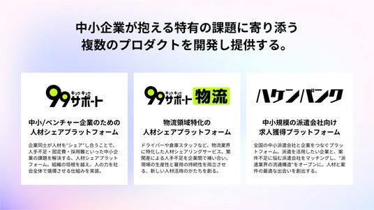- 新規プロダクトの開発・展開 物流業界特化型の『99サポート物流』、派遣業界を可視化する『ハケンバンク』をはじめ、 今後も業界別の課題に対応する新たな人材シェアプロダクトを開発します。