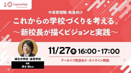 「世界とつながる探究的な学びを手軽に教室で」をコンセプトとしたEdTech教材を提供する、株式会社Inspire High(本社:東京都千代田区、代表:杉浦太一)は、これからの学校づくりをテーマにした、中高管理職向けのオンラインセミナーを11/27(木)に開催します。