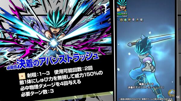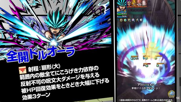 性能としては既存の「ダイ」をバージョンアップした内容で、ダメージカットやテンションを上げる特性などを搭載。こうげきタイプではあるが、防御面に優れたキャラクターと言えそうだ。メイン特技となるであろう「全開ドルオーラ」は反射不可の呪文大ダメージを与え、被HP回復効果をときどき大幅に下げるなど、原作の設定を盛り込んだ効果を持つ。
