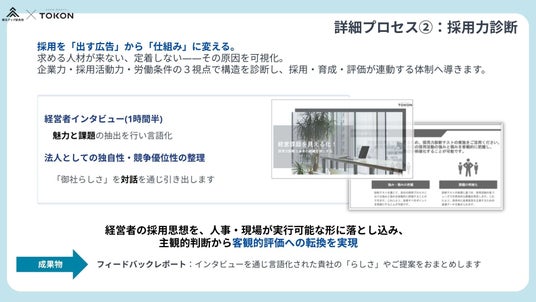 このスライドでは、企業の「らしさ」を定義し、経営者の思考を人事や面接官が実行可能な形に翻訳する仕組みが紹介されています。最終的にはフィードバックレポートとしてまとめられ、求人票や評価軸の構築に活用されます。