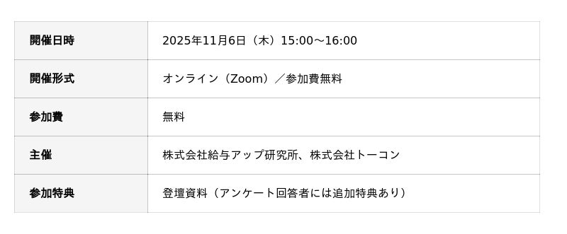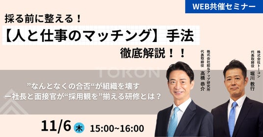 株式会社給与アップ研究所と株式会社トーコンの共催による無料オンラインセミナー「採る前に整える!【人と仕事のマッチング】手法徹底解説!!」がZoomウェビナーにて開催されました。