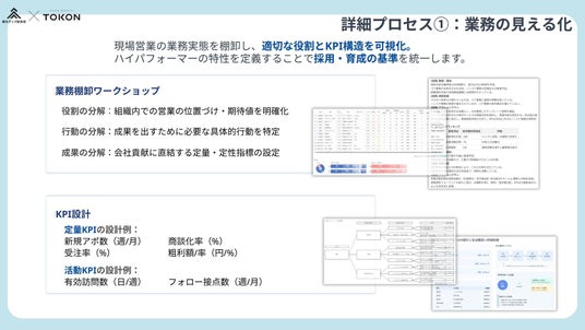 この図では、役割・行動・成果という3つの分解アプローチで業務を明確化し、KPI設計へつなげる仕組みが解説されています。KPIには「新規アポ数」「粗利率」「有効訪問数」などが含まれます。