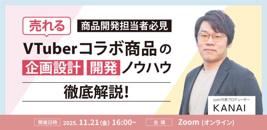 VTuber、IPコンテンツを通して日本と世界で新たな流通を生み出す“IPコンテンツの総合商社”株式会社uyet(ユエット)(本社:東京都渋谷区、代表取締役:梶田大樹)は、11月27日(木)19時より、VTuberの活用を検討している企業様向けのウェビナー「【企業担当者必見】売れるVTuber”コラボ商品“の企画設計、開発ノウハウを徹底解説!」を開催します。