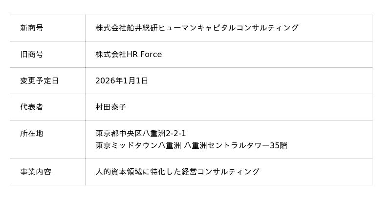 株式会社HR Force(本社:東京都中央区、代表取締役社長:村田 泰子)は、2026年1月1日付で「株式会社船井総研ヒューマンキャピタルコンサルティング」へ社名を変更することをお知らせいたします。