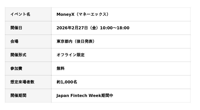 一般社団法人WebX実行委員会(本社:東京都千代田区、代表理事:酒井 良、以下「WebX実行委員会」)が主催、JPYC株式会社(本社:東京都千代田区、代表取締役:岡部 典孝)、Progmat, Inc.(本社:東京都千代田区、代表取締役 Founder&CEO 齊藤 達哉、以下「Progmat」)、SBIホールディングス株式会社(本社:東京都港区、代表取締役会長兼社長:北尾 吉孝)および株式会社CoinPost(本社:東京都千代田区、代表取締役社長CEO 各務 貴仁)が企画・運営を担当する「MoneyX(マネーエックス)」(以下「本カンファレンス」)を、2026年2月27日(金)に東京都内にて開催いたします。