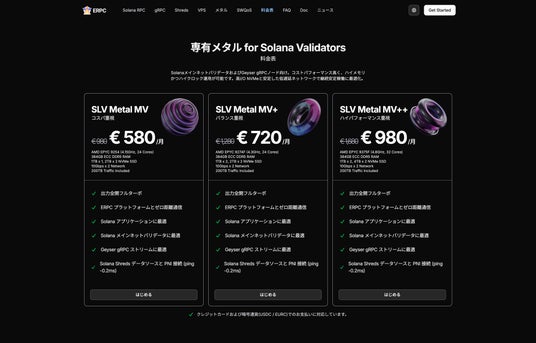 ELSOUL LABO B.V.(本社:オランダ・アムステルダム、代表取締役CEO:川崎文武)と Validators DAO が運営する ERPC は、Solana バリデータおよび gRPC ノード向けに最適化されたベアメタルサーバー「SLV Metal」シリーズのうち、コストパフォーマンスモデル「SLV Metal MV(ユーロ580/月)」をフランクフルトリージョンにて数量限定で再入荷いたしました。