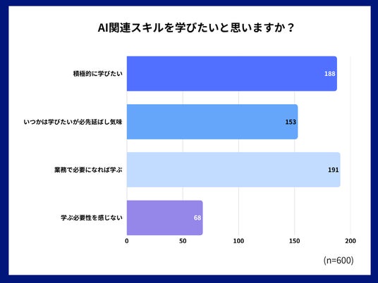 AI関連スキルを学びたいと思うか聞いたところ、「積極的に学びたい」31.3%(188人)、「いつかは学びたい(必要だと思うが先延ばし気味)」25.5%(153人)、「業務で必要になれば学ぶ」31.8%(191人)を合わせて約88.6%が学習意欲を示しました。
