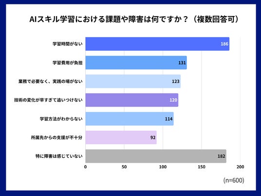 AIスキル学習における課題や障害を聞いたところ、最多は「学習時間がない」31.0%(186人)でした。また、「特に障害は感じていない」30.3%(182人)もほぼ同じ割合で並びました。