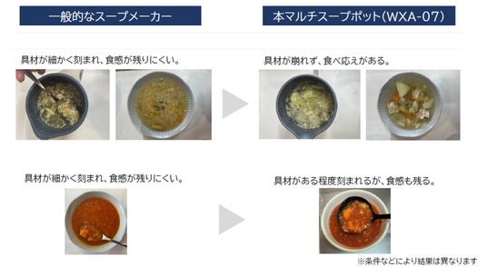 一般的なスープメーカーでは、具材が細かく刻まれ、食感が残りにくい場合があります。