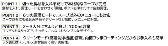 こうした背景を踏まえ、皆さまの健康と忙しい時の料理の手間をサポートする、家庭でも手軽においしく作れるスープメーカーを開発しました。