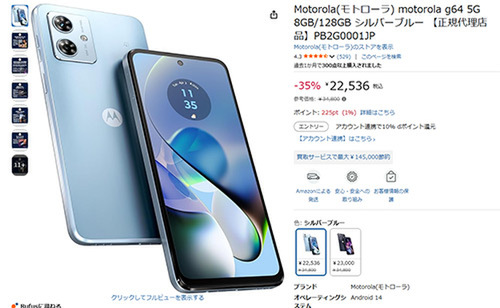 5G対応で高性能、しかも軽量! Motorola(モトローラ)のSIMフリースマートフォン「motorola g64 5G(8GB/128GB)」が、Amazonセールに登場しました。