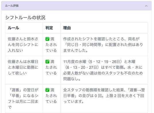 作成シフトが口語でのルールに従っているかもAIエージェントが評価