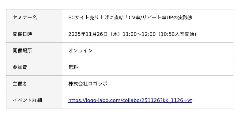 株式会社YTGATE(本社:東京都中央区、代表取締役 高橋祐太郎、以下「YTGATE」)は、2025年11月26日(水)、株式会社ロゴラボ(本社:東京都中央区、代表取締役:野崎智裕)主催セミナー『業界リーダーに学ぶ ECサイト売り上げに直結!CV率/リピート率UPの実践法』において、代表取締役 高橋祐太郎が登壇することをお知らせいたします。