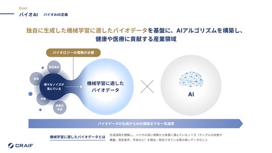 バイオAIとは、機械学習に適したバイオデータを独自に生成・解析し、AIアルゴリズムを構築することで、健康・医療分野に新たな価値を創出する産業領域です。