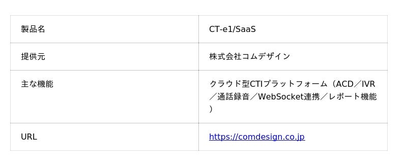 コムデザインは、2000年に創業。2008年からクラウド型CTIサービス「CT-e1/SaaS」の提供を開始。高い拡張性を持つ自社開発のアーキテクチャと利用者のニーズにきめ細かく対応可能なサービスモデル「CXaaS」により、小規模から大規模まで業種を問わずコンタクトセンターに支持されています。
