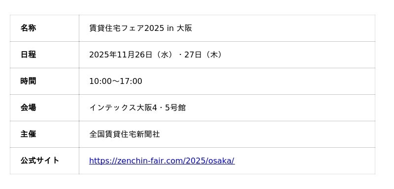 株式会社ClassLab.(代表取締役社長:古屋敷 大樹、本社:大阪府中央区、以下、ClassLab.)は、2025年11月26日(水)・27日(木)にインテックス大阪で開催される「賃貸住宅フェア2025 in 大阪」に出展いたします。