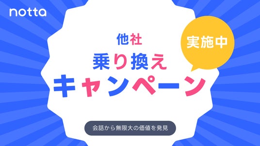 Notta株式会社(本社:東京都千代田区、代表取締役:Ryan Zhang、以下「当社」)は、AI議事録サービス「Notta」の法人ユーザーおよびAIボイスレコーダー「Notta Memo」のユーザー増加を記念し、より多くの企業・団体にご利用いただくために「乗り換え応援キャンペーン」を実施いたします。