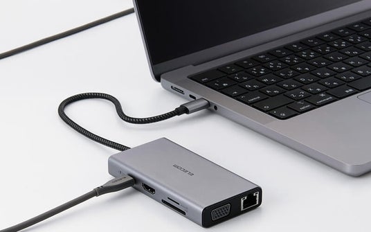 USB 5Gbps対応USB-A×2ポートとUSB2.0対応USB-A×1ポートを搭載するほか、SDカードスロットとmicroSDカードスロットをそれぞれ1スロットずつ搭載。さらに、1000BASE-T対応LANポートや4極ステレオミニジャックも備えた多機能10ポートモデルです。また、USB Power Delivery(最大100W)対応の充電専用ポートを搭載し、パソコンを充電しながら使用できます。USB Type-C(TM)(USB-C(TM))接続ケーブル一体型のコンパクト設計で携帯性に優れ、出張やテレワークなどのさまざまなシーンで活躍します。