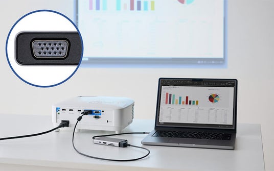 - VGAポートを搭載しているので、商談先などでVGAポートしかないプロジェクターやモニターにも映像出力ができます。VGA接続での解像度は1,080pです。