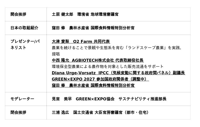 グリーン社会の実現に向けた取組を進めるGREEN×EXPO 2027において、ネイチャーポジティブは開催意義にかかわる概念であり、今回は国際会議における重要な発信機会となります。当協会からは見宮サステナビリティ推進部長がモデレーターとして登壇し、公・民・学それぞれの立場のパネリストからネイチャーポジティブの意義や取組、GREEN×EXPO 2027に向けた期待と各自の決意を引き出し、発信いたします。