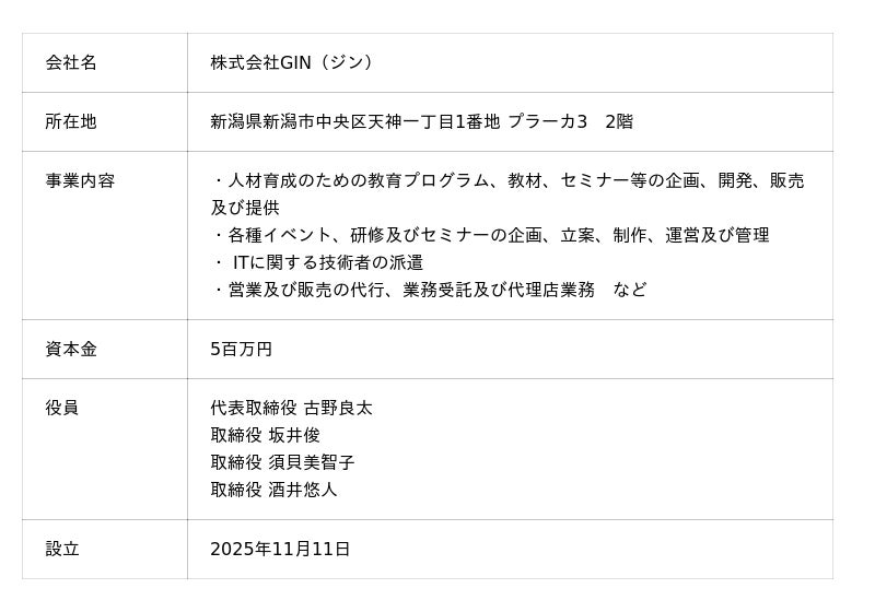 SES事業の立ち上げを通じ、企業にエンジニア組織を創出する株式会社enginepot(本社:大阪府、代表取締役:古野良太、以下enginepot)と「Update Local」をミッションに掲げる株式会社DERTA(本社:新潟県新潟市、代表取締役CEO:坂井俊、以下DERTA)は、2025年11月11日付でジョイントベンチャー(以下、本JV)「株式会社GIN(ジン)」を設立したことをお知らせします。