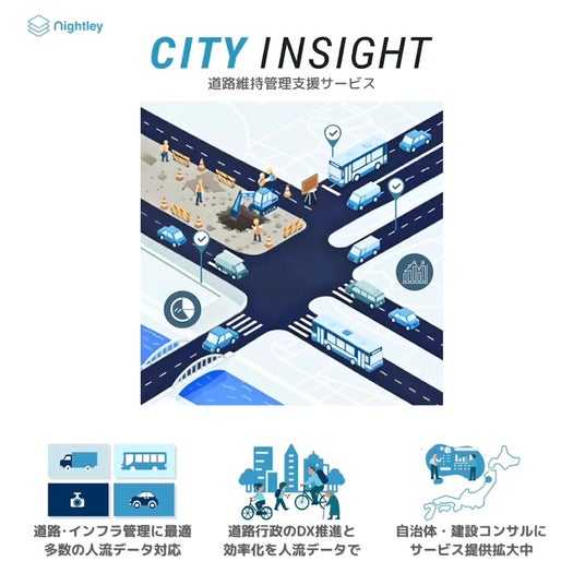 「CITY INSIGHT 道路維持管理支援サービス」は、乗用車・商用車・ドラレコ・アプリGPSデータなどの道路インフラの利用実態分析に有用な人流データ(車両走行データ)を分析することで、地方自治体の道路インフラ維持管理業務の効率化とDXを実現する新サービス(2025年5月~)です。