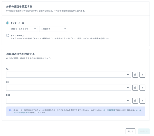 選択できるメールアドレスはSORACOMアカウントに登録されているメールアドレスである必要があります。追加したい場合は、メールアドレス追加方法をご確認ください。