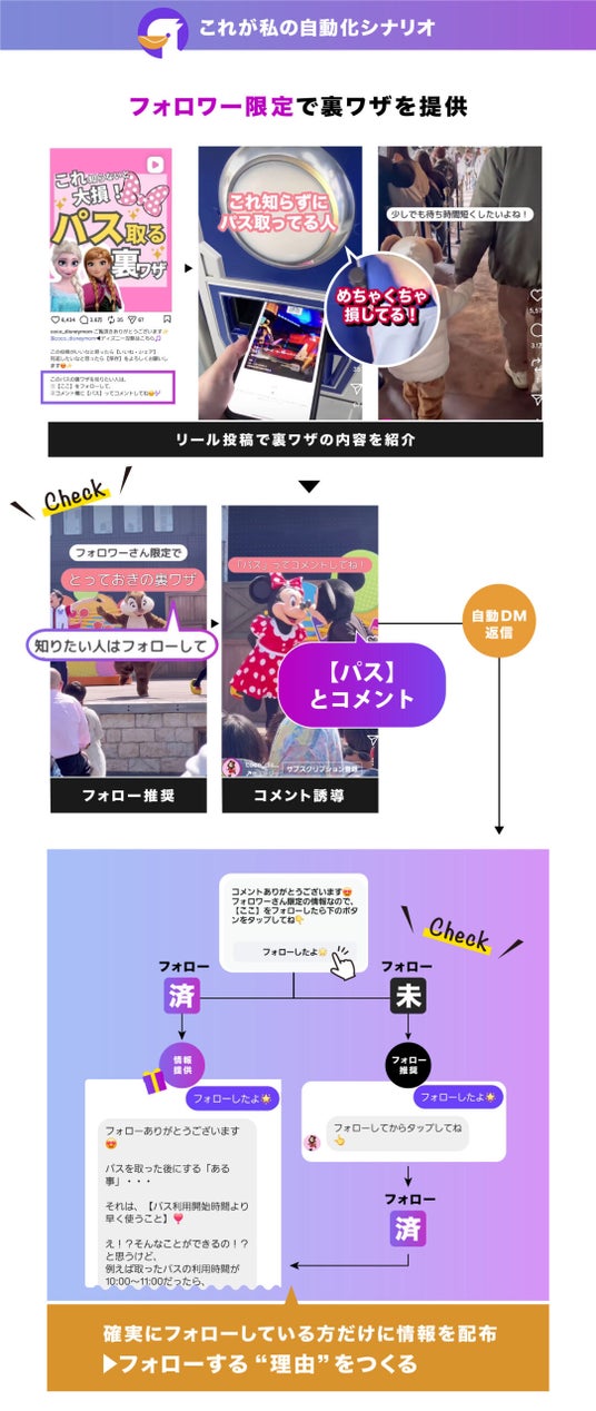 Instagramリール「パス取る裏ワザ」にて、フォロワー限定で情報を自動配布する仕組みをエルグラムの自動応答機能で構築。