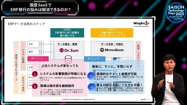 ウイングアーク 佐土原氏:データのサイロ化の悩みも、国産SaaSで解消できると思っています。サイロ化はなくせないので、その被害を最小限に抑えるのがポイントです。我々は、2つのステップを用意していて、まずは基幹システムや手元で保持するExcelやCSVを、データ分析基盤の「Dr.Sum」に統合します。情シスはERP移行における影響範囲が明確となり、現場側もDr.Sumを経由してこれまでと同じインターフェイスを継続できます。