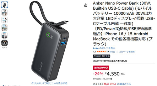 USB-Cケーブルが本体に内蔵された一体型デザインで、30Wの高出力と10000mAhの大容量を両立。参考価格5,990円のところ、24%OFFの4,550円というお買い得価格で手に入ります。