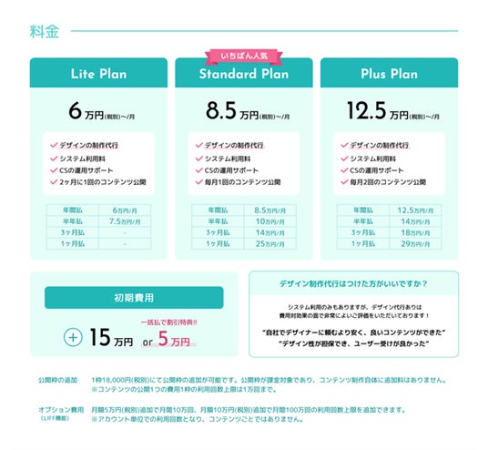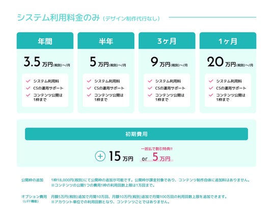 - システム利用料:制作支援を含まないシステム利用料のみのプランです