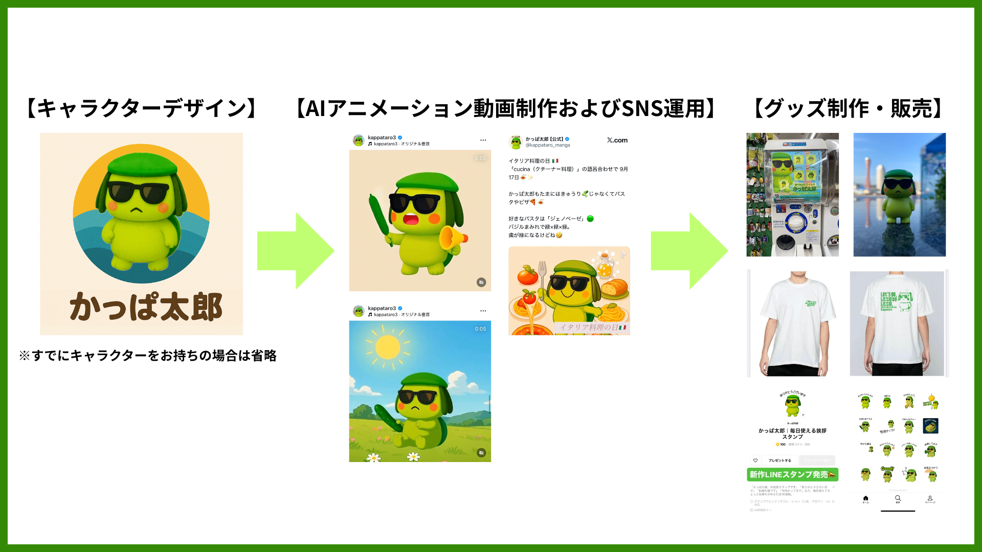 AIアニメーション動画制作とキャラクターデザインを手がける株式会社かっぱ太郎(本社:兵庫県神戸市、代表取締役:権藤 歩)は、株式会社アリカ(本社:兵庫県神戸市、代表取締役:中嶋 翼)、RAMO(本社:兵庫県神戸市、代表:川本 裕紀)と業務提携し、中小企業や自治体、店舗などを対象とした「キャラクタービジネス・ワンストップ支援サービス」を2025年11月12日より提供開始します。本サービスは、キャラクターの制作・活用に課題を持つ事業者の皆さまに、企画からデザイン、SNS運用、グッズ制作・販売までを一貫して支援するものです。