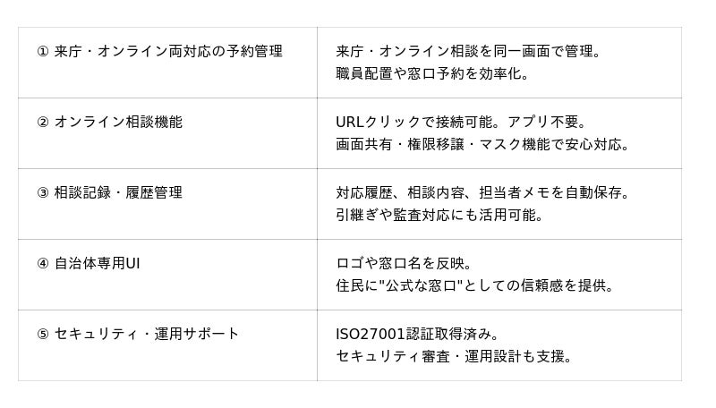 そのノウハウをもとに開発された「自治体版ROOMS」は、来庁予約・オンライン相談・相談記録管理をひとつのシステムで実現。自治体が無理なくオンライン相談を取り入れ、住民対応のデジタル化を段階的に進められる環境を提供します。