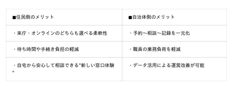 住民は自宅からワンクリックで相談でき、職員はシンプルな操作で予約や記録を管理可能。