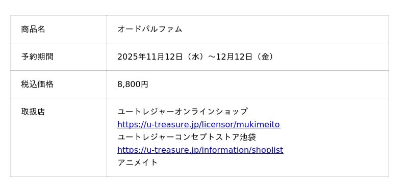 株式会社ユートレジャー(本社:東京都新宿区、代表取締役社長:青木 興一、株式会社ケイ・ウノの連結子会社)は、罪悪都市プリズン戦略RPG『無期迷途』とコラボレーションした「オードパルファム(香水)」の予約受け付けを、2025年11月12日(水)~12月12日(金)の期間、ユートレジャーオンラインショップ、ユートレジャーコンセプトストア池袋にて行います。