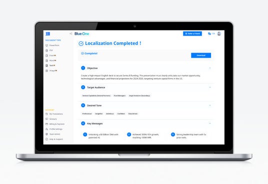 株式会社イエローブルー、資料の“文脈”まで読むAI翻訳サービス「Blue One」を正式リリース!独自の「ディープコンテキストAI」が、資料のレイアウトを維持したまま、専門家レベルの翻訳を実現。